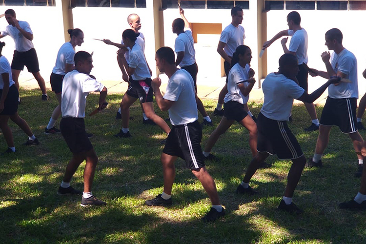 Os alunos do Curso Básico de Formação Policial Militar (CBFPM) do Comando Regional de Polícia Ostensiva do Vale do Rio Pardo (CRPO/VRP), participaram na tarde de sexta-feira, 25, do 1° Workshop de Artes Marciais, realizado na Sede do Batalhão, em Rio Pardo. Os alunos-soldados se revezaram entre as oficinas que foram realizadas ao ar livre com duração de aproximadamente 45 minutos cada. De acordo com a BM, as artes marciais auxiliam o serviço policial na contenção da violência. No lugar de armas letais ou de efeito moral, policiais usam das técnicas para dominar o oponente.