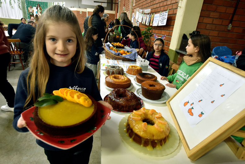 No “Sementes do Futuro”, a turma do 3º ano demonstrou como a bergamota pode ser reaproveitada de forma sustentável. Entre as alternativas estavam receitas de bolos que têm a fruta da época como ingrediente.