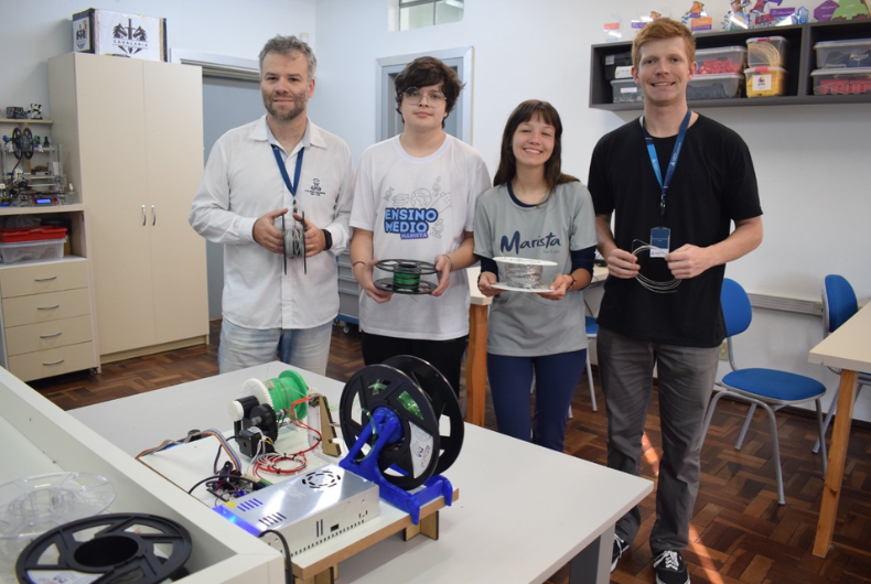 Os estudantes do Ensino Médio e membros da Equipe Cavalaria de Robótica do Colégio Marista São Luís, Lucas Weber Freitas (1º ano) e Luana Wolffenbüttel Machado (3º ano), com apoio do educador e instrutor de robótica Fabrício Noronha e do estagiário e ex-aluno Lucas Krainovic Landesvatter, desenvolveram um projeto inspirado na sustentabilidade e reciclagem de garrafas PET. Buscando atender às necessidades das estruturas mecânicas que criam ao longo do ano, especialmente em termos de rigidez, elaboraram um projeto que envolveu a aquisição de componentes eletrônicos e a impressão de peças necessárias para construir dois protótipos. O primeiro serve para filetar uma garrafa, ou seja, cortá-la em pequenos filetes de aproximadamente 10 milímetros. O segundo protótipo é capaz de derreter esses filetes e transformá-los em filamento de 1,75 milímetro, ideal para impressoras 3D.