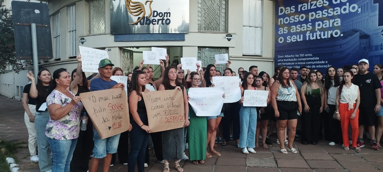 Na noite desta sexta-feira, 21, foi realizada uma movimentação em frente a Faculdade Dom Alberto, na unidade da Rua Ramiro Barcelos, em Santa Cruz do Sul. O motivo é o anúncio do encerramento das atividades em sete cursos presenciais na instituição.
