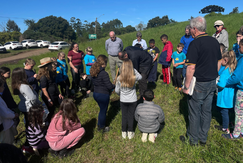 Eles participaram do plantio de dois pés de erva-mate e aprenderam sobre o manejo correto e os cuidados ao longo do desenvolvimento da planta. Também receberam explicações a respeito da organização do espaço, implantado em 2024 em alusão aos 200 anos da imigração alemã no Rio Grande do Sul. Na ocasião, foram plantadas 200 mudas de 14 espécies de árvores do bioma da Mata Atlântica.