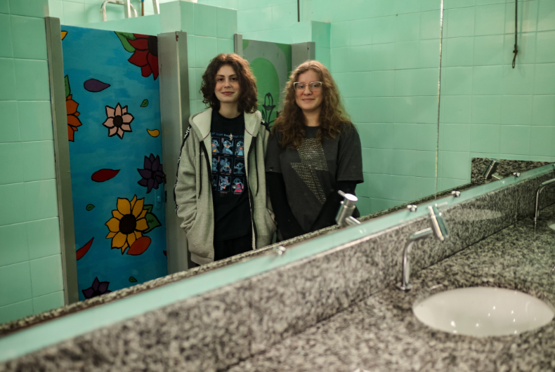 Junto de sua turma, as alunas Maria Isabel Claudino, 17 anos, e Sophia Brandt, 16, do 2o ano do Ensino Médio, trabalharam em um desenho com fundo azul e flores coloridas. Maria Isabel gostou da oportunidade de poder se manifestar dentro do ambiente escolar. “É uma forma de expressarmos nossos sentimentos. Eu, por exemplo, sinto paz vendo as flores.” Sophia disse que gostou de ver a escola com um toque decorativo dos alunos. “Fiquei feliz porque nós fomos incluídos. Me senti reconhecida.”