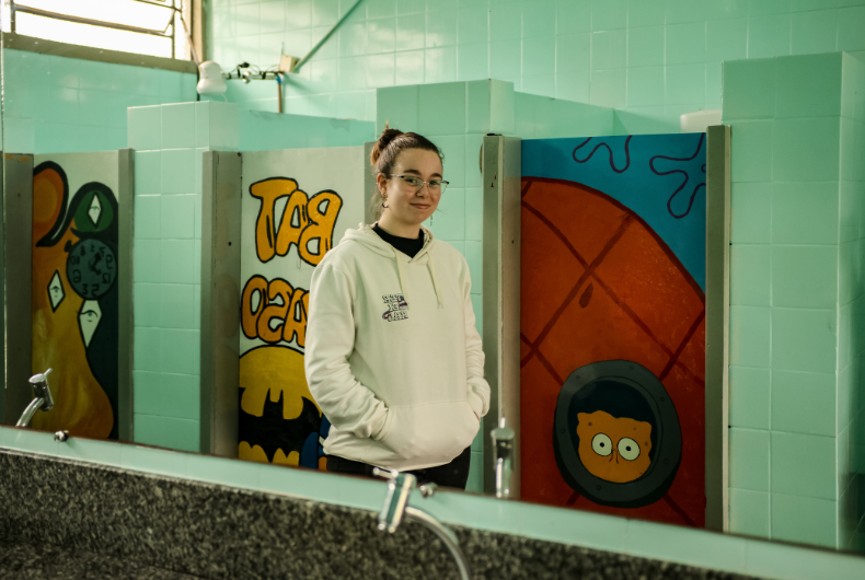Uma das portas conta com uma ilustração do Bob Esponja, personagem de animação famoso pelas aventuras no fundo do mar. O desenho foi reproduzido por Fernanda Braga, 18 anos. Ela e sua turma do 3º ano do Ensino Médio optaram por fazer esse desenho porque queriam algo relacionado à água, já que o símbolo da turma é um polvo.