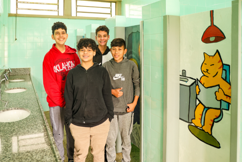 Após a finalização dos desenhos, os estudantes escolheram uma ilustração por turma que seria feita na porta de um dos banheiros. O projeto precisou ser paralisado em razão da enchente, mas em junho as turmas iniciaram as pinturas. Os pincéis e tintas foram disponibilizados pelo educandário, e todo o trabalho foi coordenado pelo professor Dionathan.
