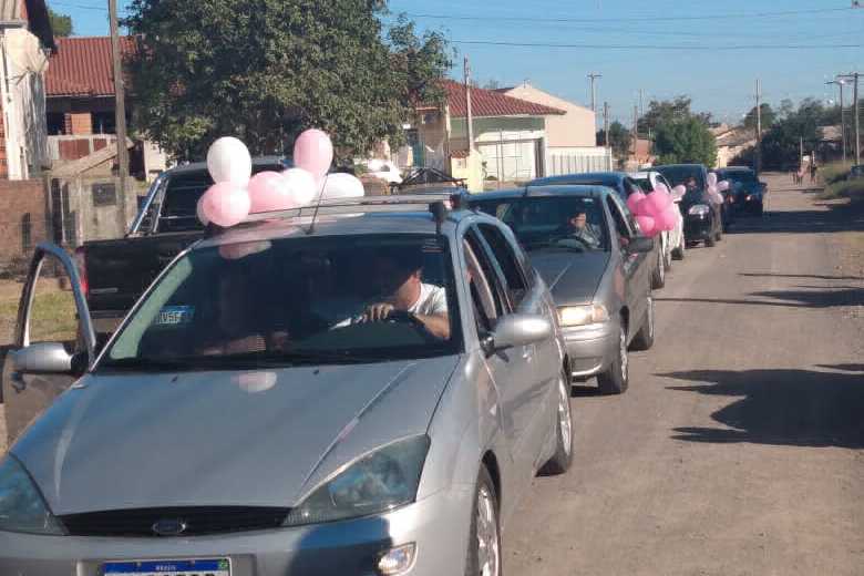 Em meio à pandemia e diante da impossibilidade de fazer o tradicional chá de bebê, familiares e amigos de uma gestante moradora do Bairro Esmeralda em Santa Cruz do Sul, resolveram improvisar. Na tarde deste domingo, eles organizaram uma carreata que passou em frente à casa da futura mamãe para deixar os presentes e demonstrações de carinho.