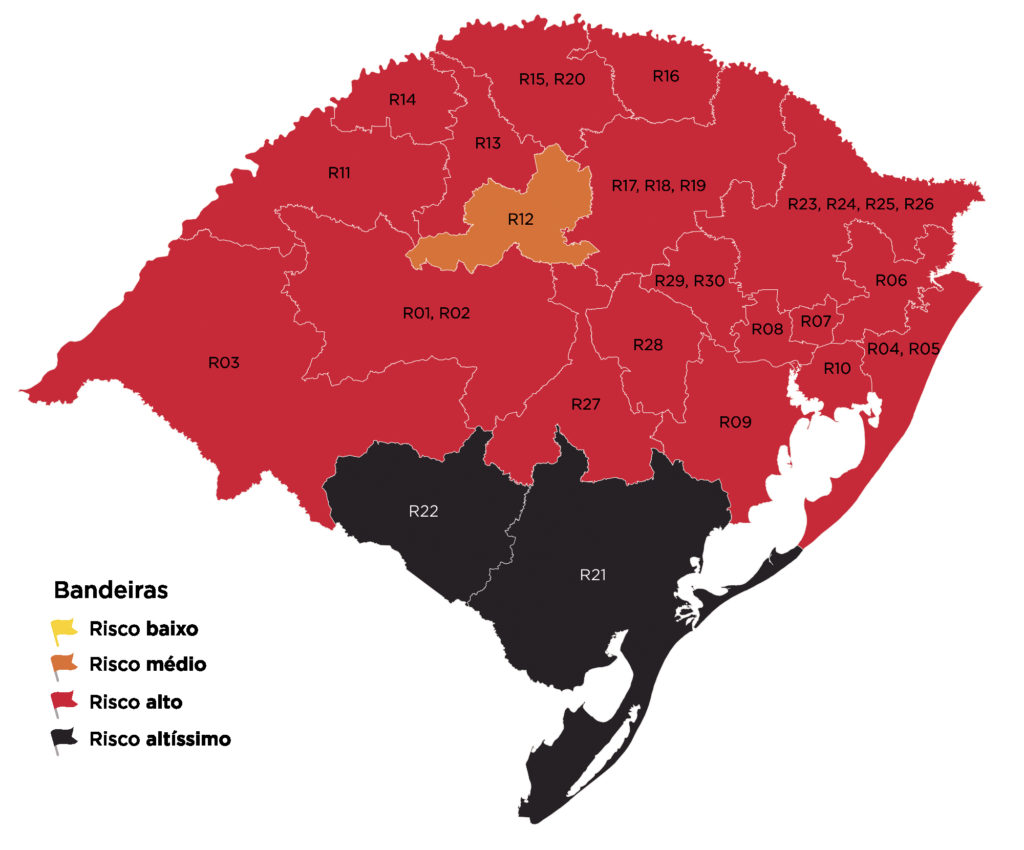 É importante ressaltar que apesar de ser a classificação de risco mais elevada prevista pelo modelo, a bandeira preta não significa lockdown. Ela indica que tanto a capacidade da rede hospitalar como o contágio pelo coronavírus estão em níveis críticos e isso exige medidas mais severas. O Piratini reforça que considerou principalmente a baixa quantidade de leitos de UTI disponíveis nos hospitais e a crescente demanda para efetivar as bandeiras pretas e também negar os demais pedidos de recursos recebidos.