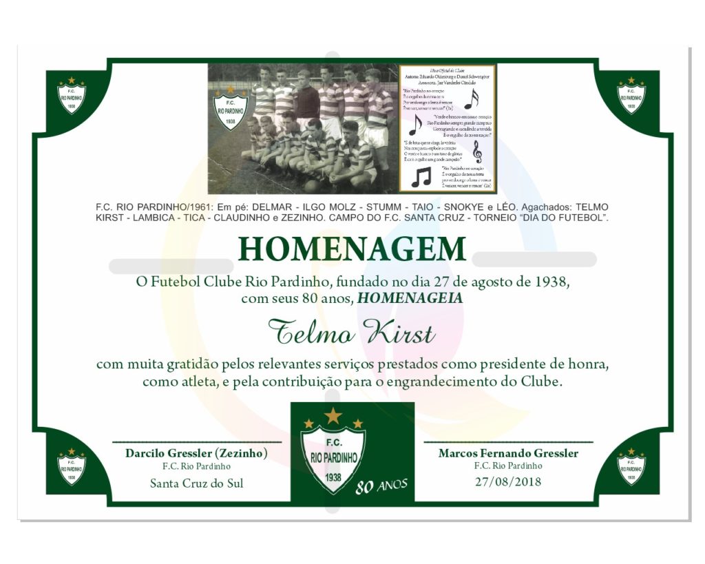 Engana-se quem pensa que a ligação do ex-prefeito Telmo Kirst com o futebol começou no FC Santa Cruz, clube do qual foi presidente entre o fim dos anos 1990 e começo dos anos 2000. Muito antes, na juventude, Telmo foi também jogador – e dos bons, de acordo com quem o viu jogar nos gramados do município. Ele atuava na posição de ponta direita e, antes de ingressar na carreira política, jogou no Rio Pardinho e depois no Linha Santa Cruz, na década de 1960.