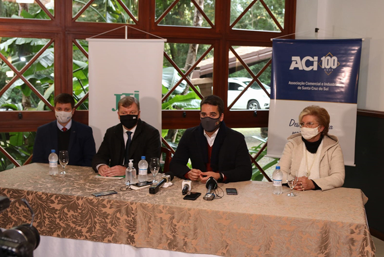 Após assinatura de contrato de concessão da RSC-287 com a Rota de Santa Maria na manhã desta terça-feira, 20, junto ao viaduto Fritz e Frida, em Santa Cruz do Sul, e palestra no Tá na Hora, da ACI, o governador do Rio Grande do Sul, Eduardo Leite, concedeu entrevista coletiva à imprensa no Hotel Águas Claras. Na sequência, governador atende outros compromissos.