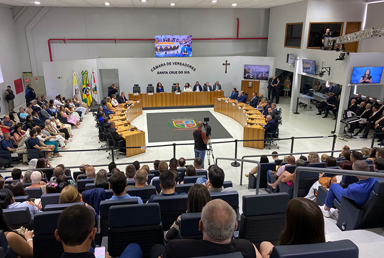 A Câmara de Vereadores de Santa Cruz do Sul foi palco da posse da nova Legislatura, prefeito Sérgio Moraes (PL) e vice, Alex Knak (MDB), além dos 17 vereadores para o período entre 2025 a 2028. O momento aconteceu nesta quarta-feira, 1º de janeiro.