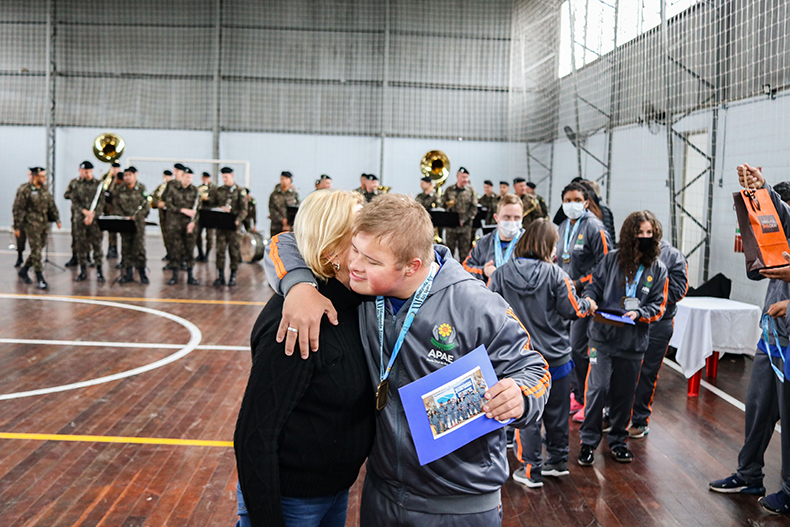 Ao som da música Tema da Vitória, imortalizada com o piloto brasileiro Ayrton Senna e apresentada pela banda do 7º Batalhão de Infantaria Blindado (7º BIB), os representantes da delegação de Santa Cruz do Sul nas Olimpíadas Especiais das Apaes foram recepcionados na manhã dessa segunda-feira, 30, no ginásio da entidade.