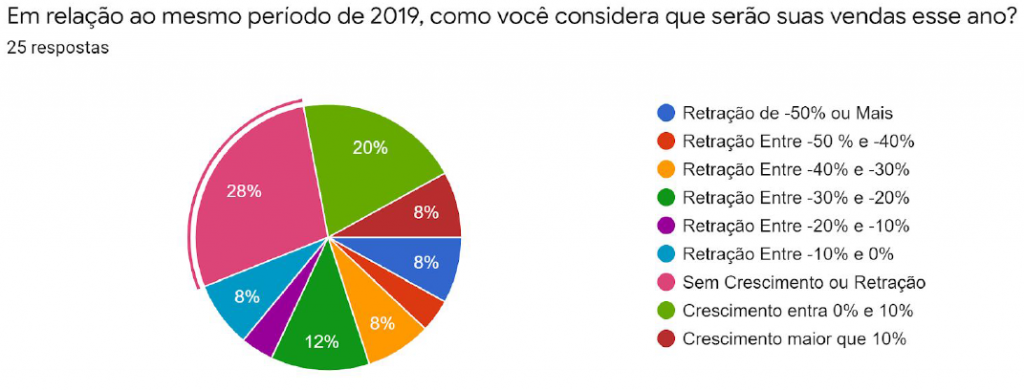 Vestuário – 83% dos entrevistados relataram queda entre 10% e 50% do faturamento; 17% não perceberam variação