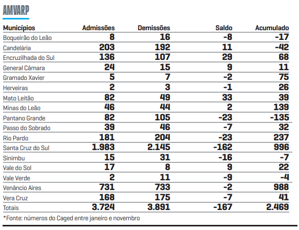 Entre os 17 integrantes da Associação dos Municípios do Vale do Rio Pardo (Amvarp), 11 apontaram saldos negativos, no comparativo entre admissões e demissões. Avaliando os dados do acumulado do ano (entre janeiro e novembro), no entanto, a região ainda tem bom desempenho, com 12 municípios com maior geração do que fechamento de vagas. Foram contratados, de maneira formal, 2.469 trabalhadores nos cinco grandes grupos econômicos: agropecuária, indústria, construção civil, comércio e serviços.