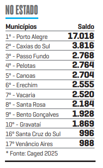 Logo atrás de Santa Cruz, no acumulado do ano, vem Venâncio Aires. Os empreendimentos venâncio-airenses têm saldo positivo de 988 contratos, em 2026. Isso faz com que seja o 17º maior gerador de emprego formal do Rio Grande do Sul. Em novembro, diminuiu duas vagas no seu estoque, tendo admitido 731 e fechado 733.