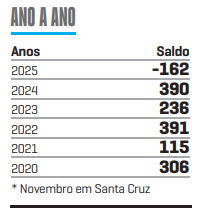 É o maior número de admissões registrado no período (janeiro a novembro) desde o início da série histórica (2020). O índice representa um aumento de 67,1% em comparação a 2020 e de 5,8%, a 2024. O setor de serviços foi o que apresentou o maior saldo de janeiro a novembro de 2025 (43.356 postos), seguido pela indústria (19.790), comércio (10.414), agropecuária (5.977) e construção (3.390).