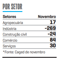 Ao se analisar somente novembro, o Rio Grande do Sul teve maior crescimento percentual na agropecuária, com 2,23%, somando 2.258 novas vagas; o comércio contabilizou 0,63%, com 4.197. O segmento de serviços ampliou em 1.712 contratos. Indústria, com -0,39%, e construção civil, com -0,43%, demitiram mais do que contrataram.