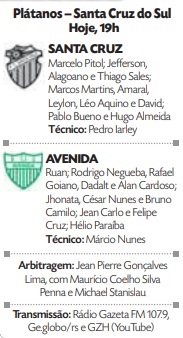 Márcio Nunes acredita que o Avenida não chega como favorito para o clássico. “Não somos favoritos. O investimento do Santa Cruz é alto. O campeonato é equilibrado. Cada jogo é uma batalha”, salientou. O treinador enfatizou que a equipe ganhou confiança pela vitória obtida diante do Ypiranga. “Foi com a cara do Márcio Nunes. Uma equipe aguerrida, lutando por todas as bolas. Estava faltando esse querer, vibrar, jogar com o coração. Conseguimos implantar isso. Além disso, nosso time tem construção a partir da defesa, triangulações, mudança de corredor e aproximação”, destacou sobre o triunfo que antecedeu o clássico.