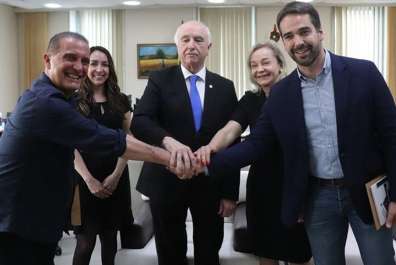 Em meio a uma campanha marcada por tensões e bate-bocas, ninguém imaginaria ver Eduardo Leite (PSDB) e Onyx Lorenzoni (PL) sorridentes em uma mesma fotografia a poucos dias da votação. Quem conseguiu a proeza foi o presidente do Tribunal Regional Eleitoral (TRE-RS), desembargador Francisco José Moesch, que tomou a iniciativa de reunir os dois candidatos a governador nessa quarta-feira, 26. Ao final, definiu o momento como “uma reunião histórica e marcante”.