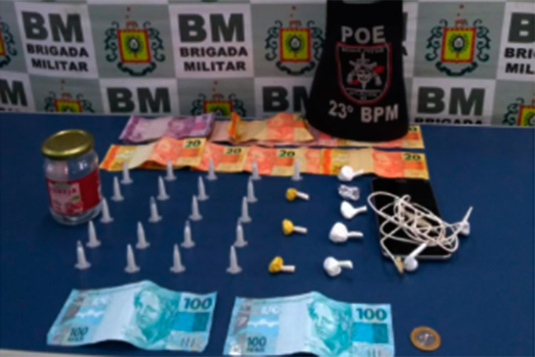 Após a abordagem de um suspeito, os policiais encontraram na revista um aparelho celular, R$ 376,00 em cédulas diversas e uma porção de maconha. Pelo barro nos tênis do homem, os policiais suspeitaram que mais itens poderiam estar escondidos em um mato próximo. Na raiz de uma árvore, foi encontrado um vidro com 21 pinos e sete porções de cocaína. Ele foi conduzido à Delegacia de Polícia para a autuação do flagrante.