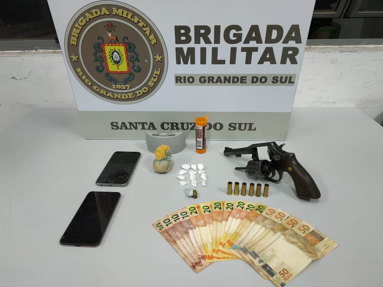 Em vistoria no pátio da residência, foi localizado o revólver utilizado pelo criminoso, que estava com a numeração raspada. Durante revista na bermuda do acusado, foram localizadas 12 petecas de cocaína e duas de maconha, ambas prontas para a venda.