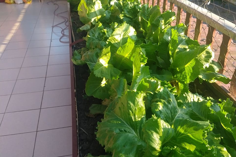 Calhas foram instaladas no telhado e a capacidade de armazenamento da chuva é de 9 mil litros. Neste período de estiagem, com essa reserva, a irrigação não foi prejudicada. Há um sistema de gotejamento que faz a água guardada abastecer os canteiros. Uma tela foi instalada para evitar excesso de luz solar e também para proteger as plantas de vento e chuva forte.