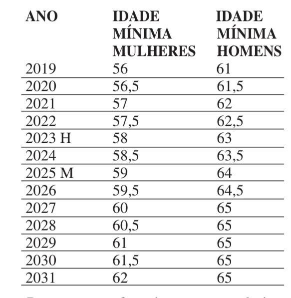 Nesse caso, o tempo de contribuição exigido “congela” e só a idade vai aumentando. A tabela abaixo traduz melhor essa regra e a sua evolução: