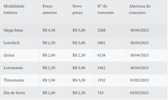Para a Mega-Sena, a Lotofácil, a Quina e a Lotomania, os novos preços valerão a partir de 30 de abril. Para o Timemania e o Dia de Sorte, o aumento entrará em vigor em 3 de maio. De acordo com a Caixa, o reajuste foi necessário para repor a inflação acumulada desde novembro de 2019, quando ocorreu o último aumento.