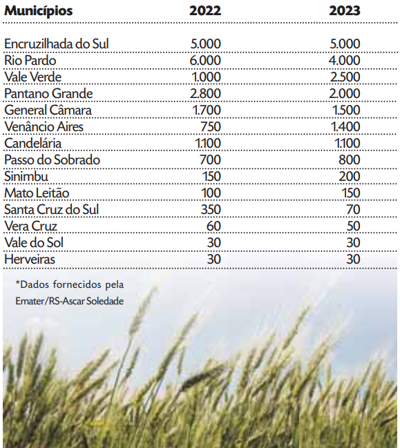 A área total cultivada com trigo na região será menor para a safra deste ano. A regional da Emater/RS-Ascar de Soledade, que engloba o Vale do Rio Pardo, estima que a produção diminua de 91,6 mil hectares para 88,5 mil hectares. A queda do preço do cereal e alta nos custos de produção são fatores que contribuem para o cenário.