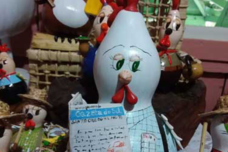Todo o artesanato é produzido com peças provenientes da natureza, como galhos, sementes e pedras. “Eles plantam diversas variedades de porongo para a confecção dos objetos, como porta-ingredientes, pesos de porta, entre outros. Depois da colheita, analisam os porongos e criam as peças”, explica a extensionista rural social Dieni Teixeira Silveira, do escritório municipal da Emater/RS-Ascar. Outras matérias-primas utilizadas pelos artesãos são fibra de bananeira e palha de milho, empregadas para elaborar artigos mais detalhados e sofisticados.