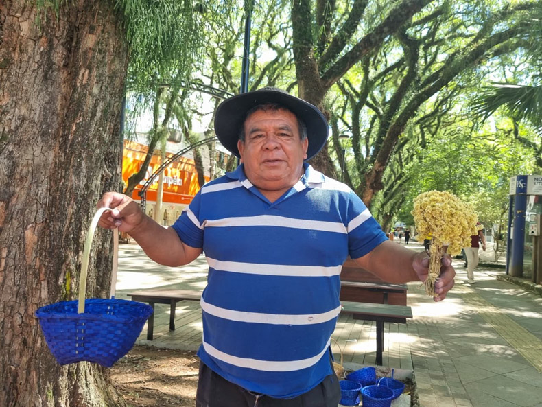 Com mais de duas décadas de experiência em Santa Cruz, o artesão Virgílio Camargo, 64, reforça o caráter tradicional da atividade. Ele vende cestas produzidas com bambu, além de macela colhida na terra indígena. Os produtos variam entre R$ 10,00 a macela e R$ 20,00 as cestas, e são preparados a partir de saberes transmitidos por gerações.