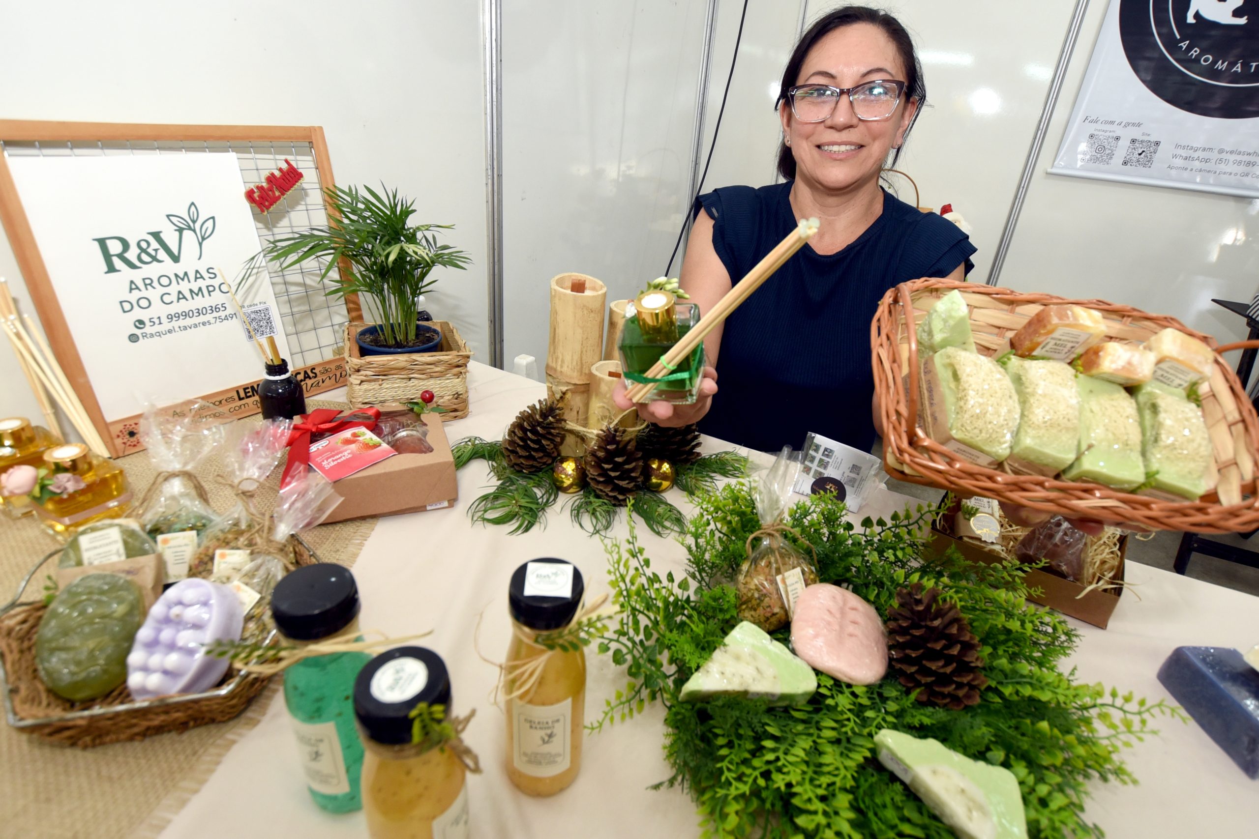 Foi a chance de a empresária Raquel Tavares apresentar os produtos da R & V Aromas do Campo. O empreendimento iniciou-se há nove meses, com produtos naturais, incluindo sabonetes e esponjas vegetais, feitos com ingredientes da sua propriedade.
