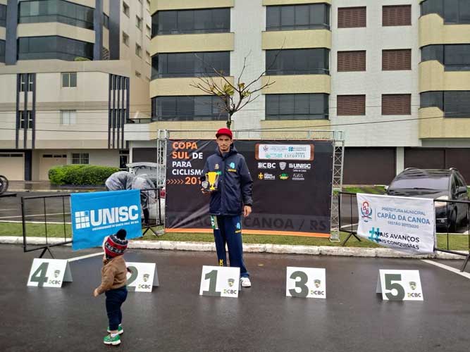 O atleta Rafael Hentschke Terres, 29 anos, da Associação Santa-cruzense de Pessoas com Deficiência Física (Aspede), conquistou o primeiro lugar na categoria Handbike H4 na 3ª Copa Sul de Paraciclismo, realizada no domingo passado, em Capão da Canoa, no Litoral Norte.