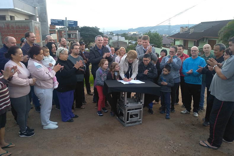 Foi assinado na tarde desta quinta-feira, 9, o termo para início das obras de asfaltamento de cinco ruas no Bairro São João, em Santa Cruz do Sul. A cerimônia contou com a presença da prefeita Helena Hermany, secretários, vereadores e também dos moradores beneficiados pela obra.