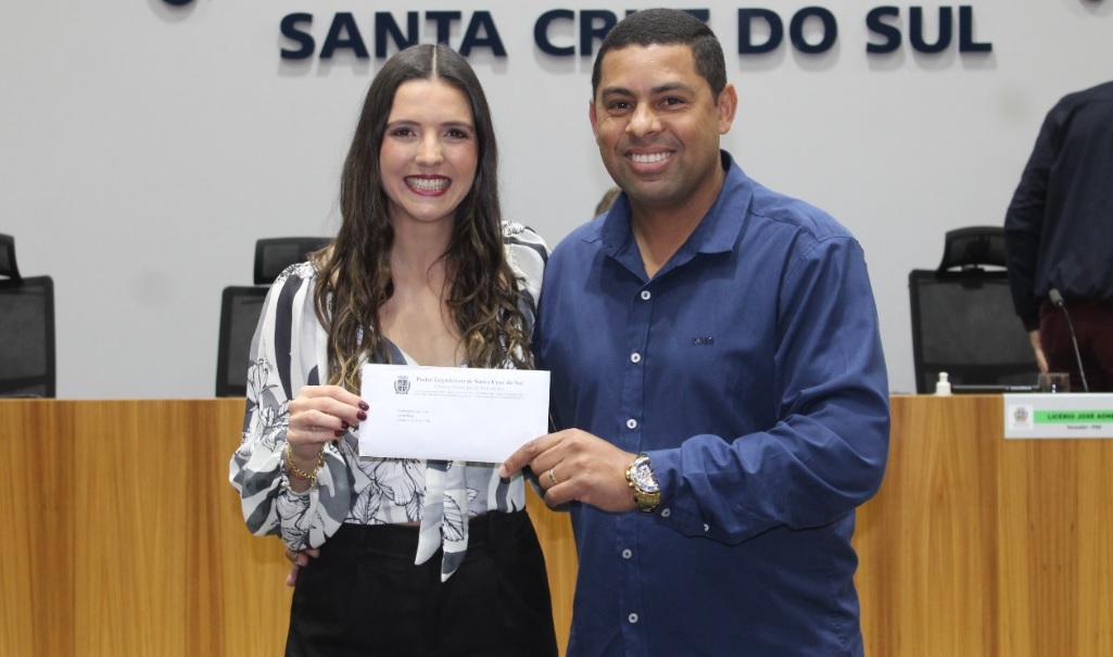 A assistente santa-cruzense Luiza Naujorks Reis da Federação Gaúcha de Futebol (FGF) e Confederação Brasileira de Futebol (CBF), recebeu uma homenagem do vereador Professor Cleber Pereira (União Brasil) na sessão ordinária da Câmara, na segunda-feira, 31.