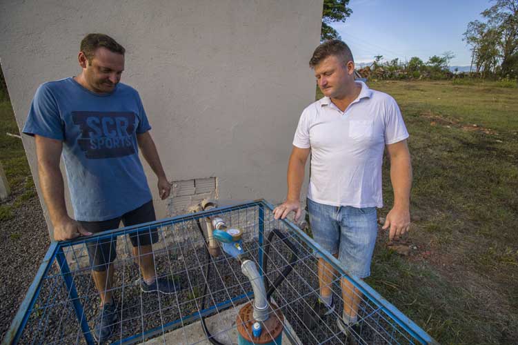 “A Prefeitura entrou com os materiais, foram 3,4 quilômetros de canos, além da mão de obra. Já a associação pagou R$ 60 mil para elaboração do projeto, perfuração do poço e aquisição de bombas”, contou o presidente da entidade, Luis Carlos Schutz. O poço tem capacidade para captar 10 mil litros de água por hora e o reservatório instalado, de 25 mil litros, leva qualidade de vida a 23 famílias – cerca de 90 pessoas.