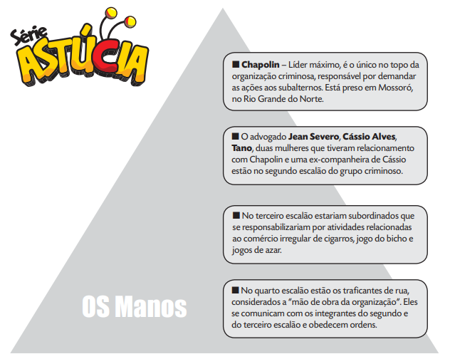 Segundo a denúncia, os membros da facção Os Manos constituíram e integraram organização criminosa, estruturalmente ordenada e caracterizada pela divisão de tarefas, com objetivo de obter vantagens de qualquer natureza. Nesse caso, o posto de liderança máxima é de Antônio Marco Braga Campos, o Chapolin, identificado também pelo apelido de Menino.