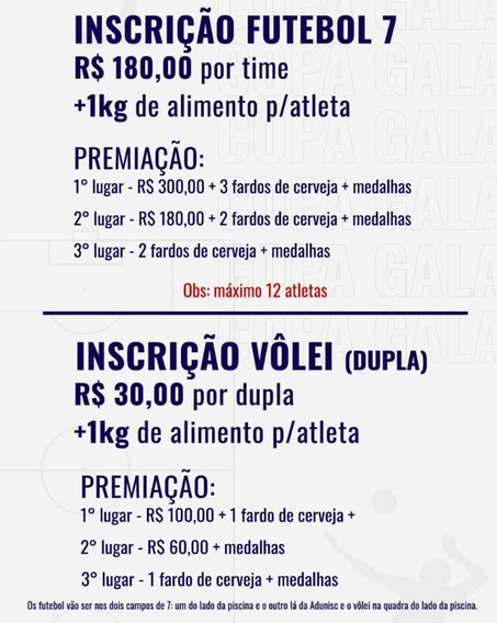 As inscrições custam R$ 180,00 no futebol sete por equipe, além de um quilo de alimento por atleta. A premiação para o campeão é de R$ 300,00. No vôlei, a inscrição é de R$ 30,00 por dupla e um quilo de alimento por atleta. A premiação para a dupla campeã é de R$ 100,00.