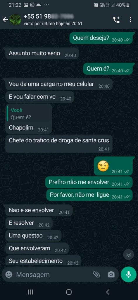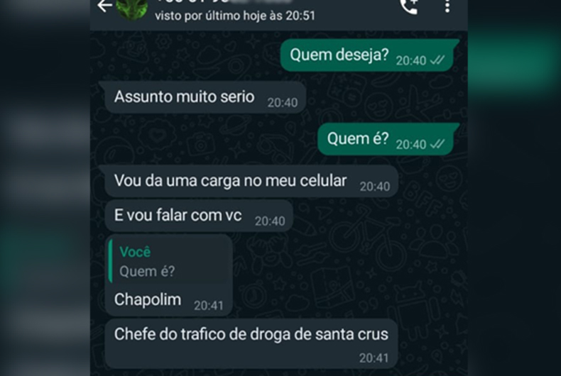 Os contatos se estenderam em momentos intercalados ao longo da tarde e da noite. Além de mensagens, o suposto integrante de facção também tentou ligar, mas a vítima recusou. “Achei estranho o fato de a imagem dele no avatar do WhatsApp ser um ET, mas não dei importância. De início, achei que era uma dúvida ou reclamação de algum cliente, mas depois ele disse que precisava falar urgente comigo, que era o Chapolin, líder do tráfico de drogas em Santa Cruz, e que integrantes da facção iriam invadir a minha casa se eu não cooperasse”, relatou a empresária, em entrevista ao Portal GAZ.