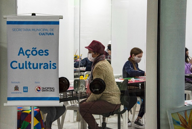 A Secretaria Municipal de Cultura (Secult) está desenvolvendo uma ação pontual com o propósito de levar a arte para mais perto do público em geral. Até o final do mês de agosto, sempre de segunda a quinta-feira, nos turnos manhã, tarde e noite, as aulas da oficina de pintura, ofertadas pelo Município de forma gratuita a interessados, poderão ser apreciadas por qualquer pessoa que estiver circulando no Shopping Santa Cruz.