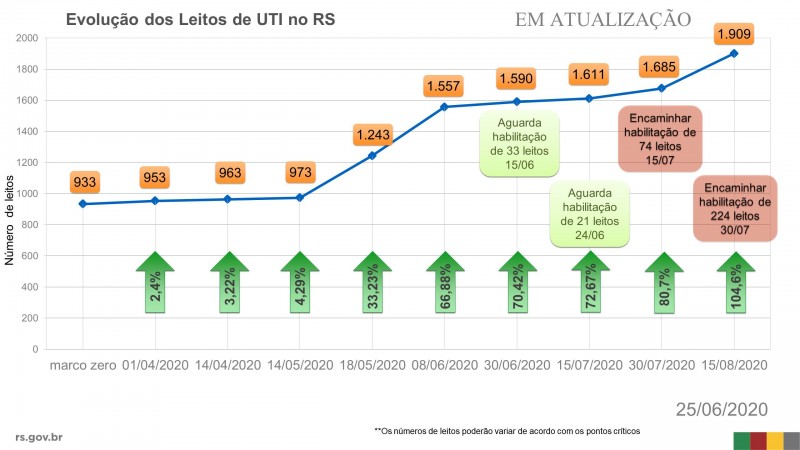 Nessa quarta, a pasta solicitou habilitação de mais 21 leitos, totalizando 54 pedidos em junho. Para julho, há previsão de encaminhamento de habilitação de mais 298. Se esses processos se confirmarem, o Rio Grande do Sul terá 1.909 leitos, um incremento de 104,6% na rede hospitalar.