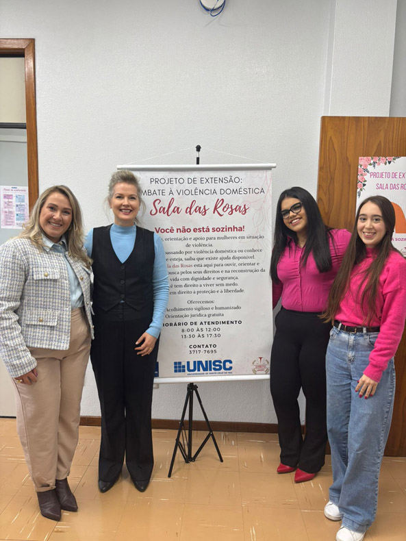 Assim surgiu a Sala das Rosas, um espaço de acolhimento sigiloso e orientação jurídica para vítimas de violência doméstica dentro da Unisc. Ele é desenvolvido por professores do curso de Direito, em parceria com o de Psicologia; sempre que uma mulher precisa de atendimento, é acolhida com orientações jurídicas e suporte mental.