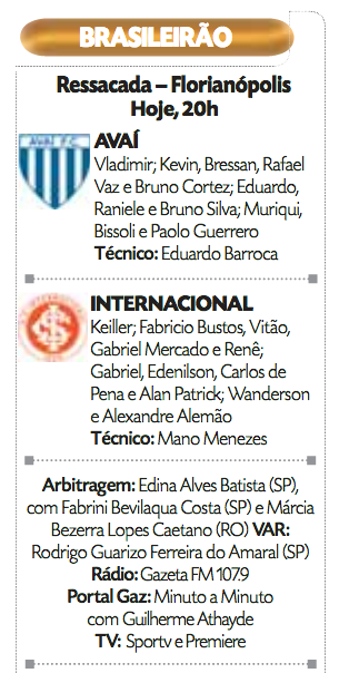 A equipe que entrará em campo contra o Avaí foi definida em três treinos fechados ao longo da semana no CT do Parque Gigante. A tendência é que Mano Menezes recoloque Edenilson na equipe titular, assim como Alan Patrick. Daniel, suspenso, será substituído por Keiller. No setor ofensivo, Alexandre Alemão chegou a sofrer com dores na virilha, mas não teve lesão diagnosticada e vai para o jogo.Para o duelo diante do time gaúcho, o técnico Eduardo Barroca contará com os retornos do lateral-direito Kelvin e do volante Eduardo, recuperados de lesão. William Pottker, velho conhecido da torcida colorada, está em recuperação por conta de um problema no adutor da coxa, não tem presença garantida. Caso ele não tenha condição, o substituto será Muriqui. No comando de ataque, estará o peruano Paolo Guerrero, outro atleta com passagem recente pelo Colorado.