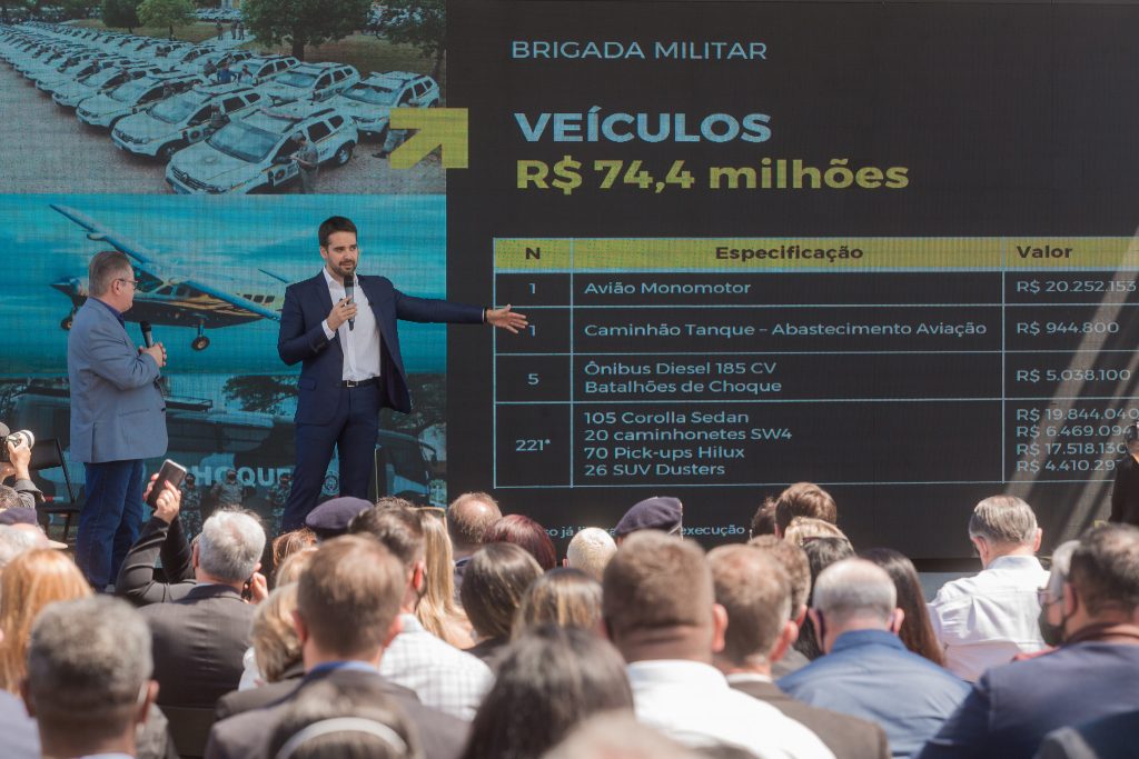 Em seguida, foram entregues viaturas e armamentos para as forças policiais. Entre as quais, 59 Dusters (total de R$ 10.007.973,53) e 15 caminhonetes Hilux (R$ 3.753.885) para a Brigada Militar (BM), 20 viaturas Dusters (R$ 3.392.533,40) para o Instituto-Geral de Perícias (IGP), nove viaturas (R$ 1.430.533,38) para a Polícia Civil, entre Dusters, SW4 e discretas, e 5 mil pistolas Taurus calibre 9 milímetros (R$ 9,35 milhões) para a BM.