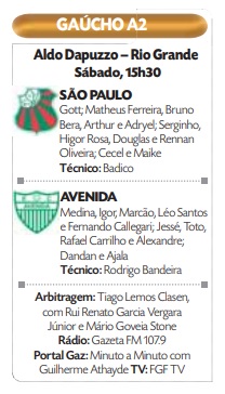 O Avenida entra em campo neste sábado, 16, às 15h30, no Estádio Aldo Dapuzzo, em Rio Grande, para enfrentar o São Paulo, pela segunda rodada no grupo B do Campeonato Gaúcho Série A2. O técnico Rodrigo Bandeira vai apostar na manutenção da formação que iniciou contra o Lajeadense. A única alteração deve ser a entrada de Dandan na vaga de William Bartholdy, que cumpre suspensão após ter sido expulso.