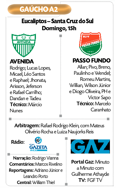 Chegou o dia mais esperado pelo torcedor do Avenida na temporada. Neste domingo, 10, a partir das 15 horas, a equipe alviverde entra em campo no Estádio dos Eucaliptos com o apoio de 2 mil espectadores para o duelo contra o Passo Fundo, que vale o acesso ao Gauchão 2023 e uma vaga na decisão do Campeonato Gaúcho da Série A2.