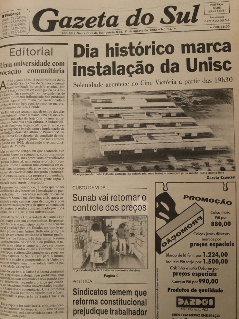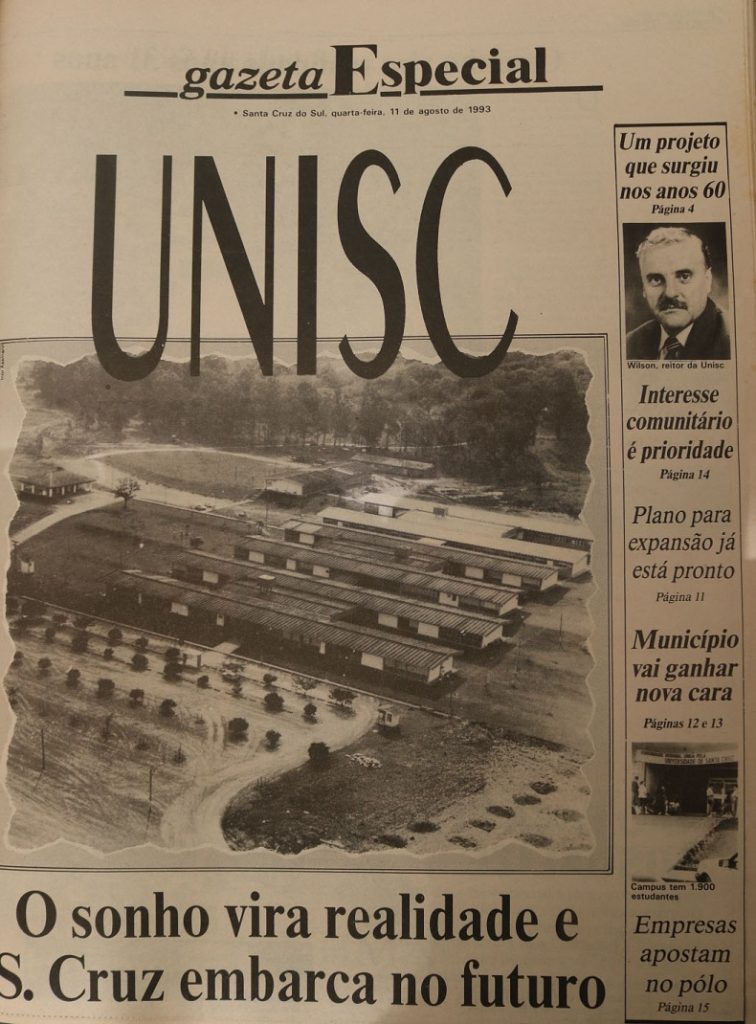 A mesma edição da Gazeta teve até um caderno especial sobre a universidade, já que, no dia 11 de agosto de 1993, uma solenidade marcou a instalação da Unisc. No suplemento, fala-se, na página 8, que as primeiras obras foram concluídas em 1984 e os primeiros estudantes foram para lá deslocados. “A área, de 42 hectares, conhecida antigamente como Chácara Meinhardt, localiza-se a dois quilômetros do centro da cidade. Ela foi adquirida em 1974, com verba que o então deputado Silvérius Kist obteve junto ao governador Perachi Barcellos”, descreve a reportagem. Ao longo do tempo, mais blocos foram sendo construídos, transformando aquilo que muitos chamavam de “descampado” em um bairro atrativo e desenvolvido.