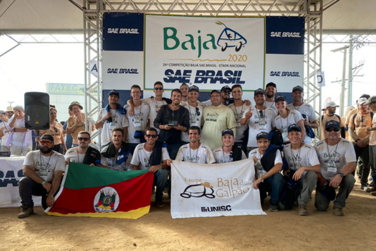 A equipe Baja de Galpão, formada por 20 pessoas, entre alunos e professores dos cursos de Engenharia da Unisc, venceu a 26ª Baja SAE Brasil, em São José dos Campos, no interior paulista, e garantiu vaga no Society of Automotive Engineers (SAE) International, a ser realizado de 3 a 6 de junho em Peoria, no estado norte-americano de Illinois. A equipe já havia vencido a etapa regional do Sul em 2016.