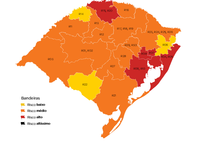 Nas regiões de Pelotas, Cachoeira do Sul e Santa Cruz do Sul, a classificação amarela passou para categoria laranja. Quatro regiões tiveram redução de risco. Caxias do Sul e Uruguaiana, que eram as duas únicas regiões com bandeira vermelha, apresentaram melhora em indicadores e migraram para a bandeira laranja. As regiões de Bagé e Santa Rosa também progrediram, saindo da bandeira laranja para a amarela.