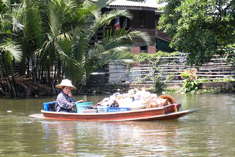 Bem além do apelo visual de belas praias e paisagens, para absorver a cultura do país que até a metade do século 20 se chamava Sião, é preciso abstrair-se da atual realidade de sua capital de 11 milhões de habitantes. Bang-kok, cujo nome oficial abreviado é Krung Thep (o nome completo tem mais de 160 caracteres), é uma megalópole suja, com trânsito caótico e ar carregado de chumbo, onde um suicídio acontece a cada hora, uma pessoa em cada cinco não tem onde morar e uma mulher em cada 30 se prostitui. A chamada “cidade dos anjos”, por outro lado, ainda conserva locais pitorescos, onde a população mora em palafitas e se locomove em pequenos barcos por canais estreitos e mercados flutuantes. Na carona de um sonoro táxi-motocicleta (tuc-tuc), saí à procura de um pequeno barco que me levasse por essas vias menos poluídas e mais tradicionais, e logo encontrei o sorridente Arthit, meu anfitrião aquático naquele final de semana.