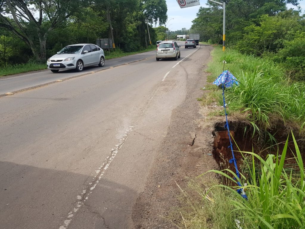 Um trecho de acostamento da BR-471 começou a ceder em Santa Cruz do Sul. O local fica perto do trevo com a RSC-287, no sentido de quem segue para a Estação Rodoviária. Pessoas que passam pela região chegaram a sinalizar o problema por causa do risco para quem circula pela rodovia.