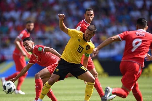Eden Hazard abriu o placar aos seis minutos em cobrança de pênalti e Lukaku ampliou aos 16. Os tunisianos descontaram com Bronn aos 18, mas Lukaku voltou a balançar a rede aos 48 minutos. No segundo tempo, Eden Hazard anotou mais um aos seis minutos e Batshuayi fechou a conta para os belgas aos 45. Ainda deu tempo para Khazri reduzir a desvantagem aos 48 minutos.